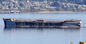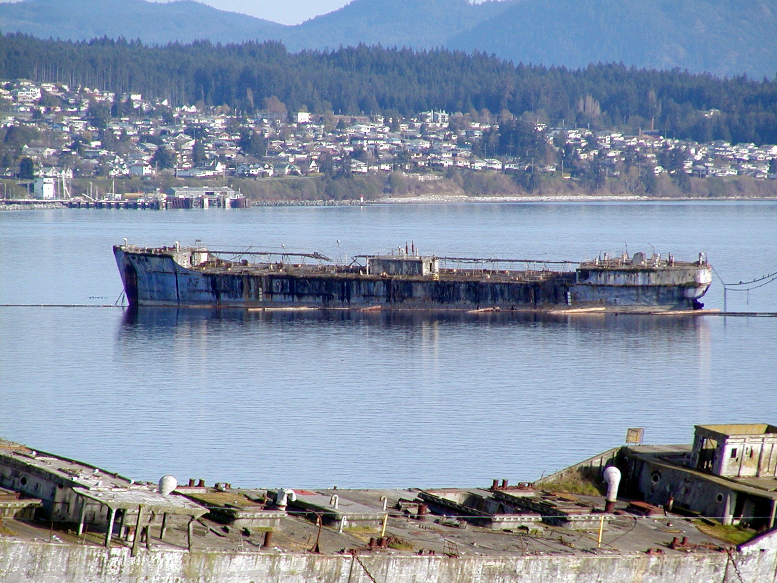 The YOGN 82 is still afloat as part of a breakwater on the Powell River in British Columbia, Canada.