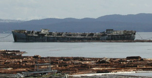 The S. S. Henri Le Chatelier is still afloat as part of a breakwater on the Powell River in British Columbia, Canada.