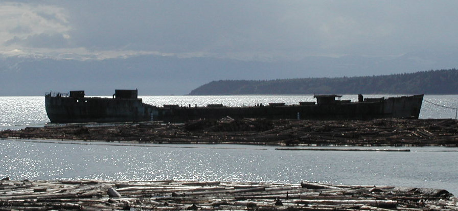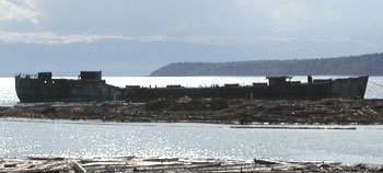 The S.S. Emile N. Vidal is still afloat as part of a breakwater on the Powell River in British Columbia, Canada.